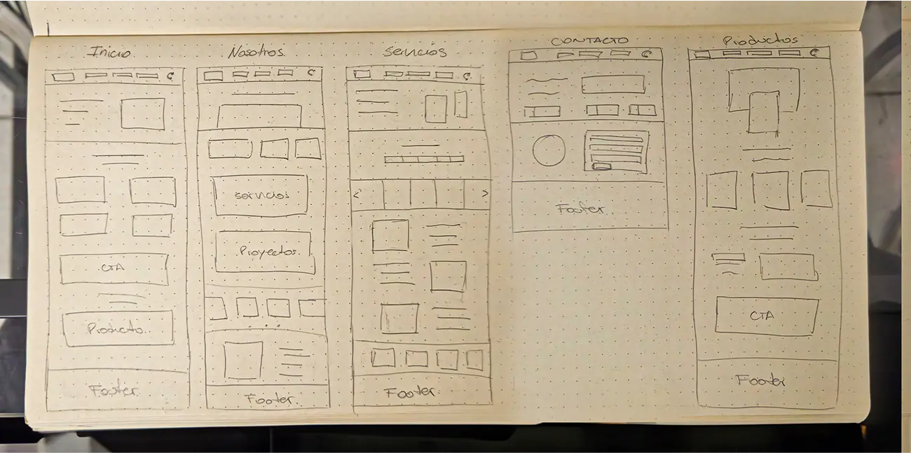 Para comenzar a visualizar las posibles mejoras en la web, realicé varios wireframes a mano. Esto me permitió explorar rápidamente diferentes disposiciones y estructuras para la nueva página.